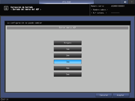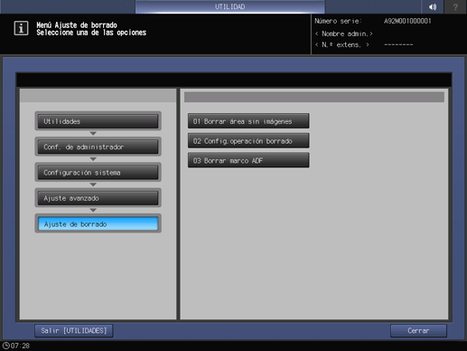 Pulse Configuración sistema en la pantalla Menú Configuración administrador máquina y, a continuación, pulse Ajuste avanzado, Ajuste de borrado y Borrar marco ADF de forma consecutiva.
