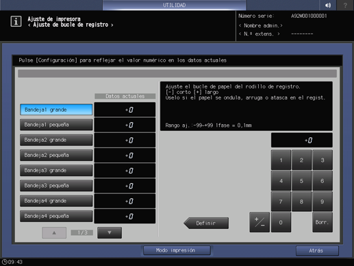 Si se requiere algún ajuste, pulse Salir ModoImpr para volver a la pantalla Ajuste de bucle de registro.