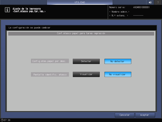 Se visualiza la pantalla Conf.atasco papel para tarea impresión.