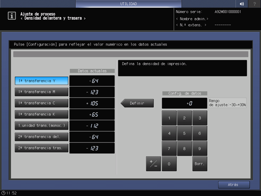 Pulse Configuración sistema en la pantalla Menú Configuración administrador máquina y, a continuación, pulse Ajuste avanzado, Ajuste de proceso y Dens. delantera y trasera de forma consecutiva.