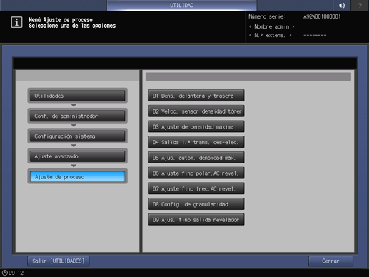 Pulse Configuración sistema en la pantalla Menú Configuración administrador máquina y, a continuación, pulse Ajuste avanzado, Ajuste de proceso y Ajuste fino polar.AC revel. de forma consecutiva.
