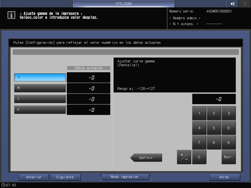 Se muestra la pantalla Ajuste gamma de la impresora.