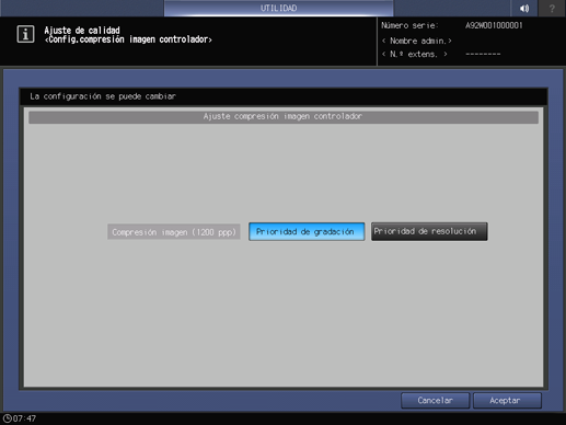 Pulse Configuración sistema en la pantalla Menú Configuración administrador máquina y, a continuación, pulse Ajuste avanzado, Ajuste de calidad y Aj. compr. imagen control. de forma consecutiva.