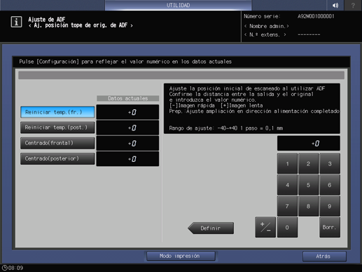 Se visualiza la pantalla Aj. posición tope de orig. de ADF.