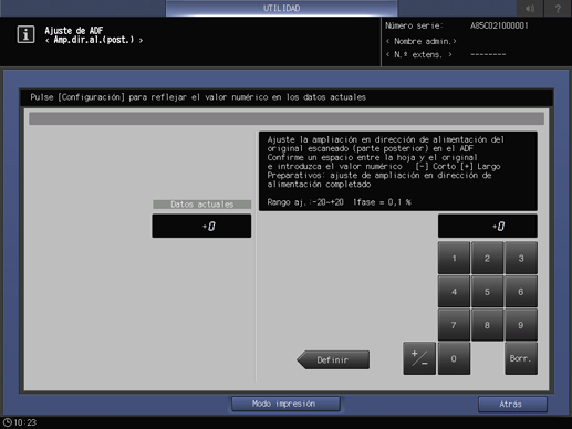 Pulse Configuración sistema en la pantalla Menú Configuración administrador máquina y, a continuación, pulse Ajuste avanzado, Ajuste de ADF y Amp.dir.al.(post.) de forma consecutiva.