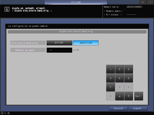 Pulse Configuración sistema en la pantalla Conf. de administrador y, a continuación, pulse Ajuste avanzado, Ajuste de ADF y Aj.elev.prev.band.originales de forma consecutiva.