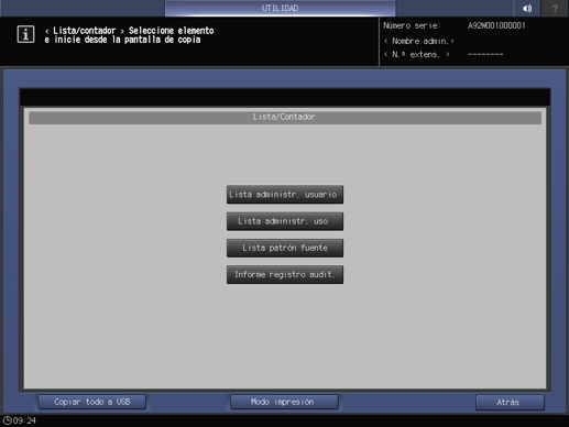 Pulse Configuración sistema en la pantalla Menú Configuración administrador máquina y, a continuación, pulse Lista/Contador.