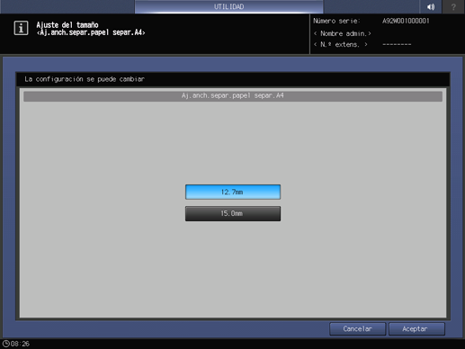 Pulse Configuración sistema en la pantalla Menú Configuración administrador máquina y, a continuación, pulse Configuración tamaño y Aj.anch.separ.papel separ.A4 de forma consecutiva.