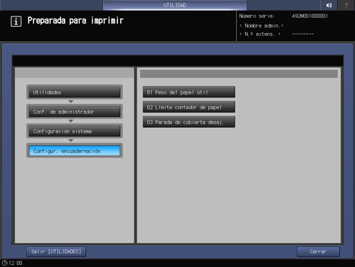Pulse Configuración sistema en la pantalla Menú Configuración administrador máquina y, a continuación, pulse Configur. encuadernación y Peso del papel útil de forma consecutiva.