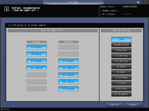 explicación adicionalSi alguno de los pesos del papel seleccionados aquí no se especifica en la bandeja que se va a utilizar para el encuadernador, la operación de encuadernado no estará disponible y se mostrará el mensaje "no adecuado".