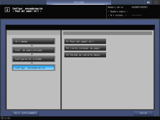 Pulse Configuración sistema en la pantalla Menú Configuración administrador máquina y, a continuación, pulse Configur. encuadernación y Límite contador de papel de forma consecutiva.