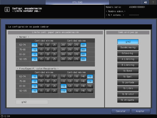 Especifique el número máximo y mínimo de hojas que será posible encuadernar como un juego para cada peso de papel.