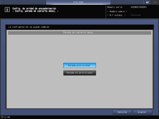 explicación adicionalPara anular el cambio, pulse Cancelar. En cualquiera de los dos casos, vuelve a aparecer la pantalla Menú Configur. encuadernación.