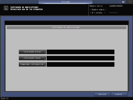 Esta configuración es la misma que la de Conf.segur.rápida - Contraseña de administrador, a la que se accede desde la pantalla UTILIDAD. La misma configuración también está disponible en Conf. de administrador - Configuración seguridad - Contraseña de administrador, si bien no estará permitida si la función de autenticación de administrador se ha ajustado a Desactivado.