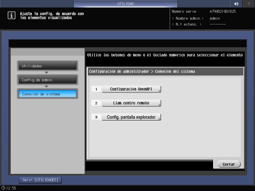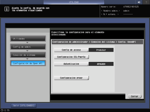 Pulse Conexión de sistema en la pantalla Menú Configuración administrador máquina y, a continuación, pulse Configuración OpenAPI.