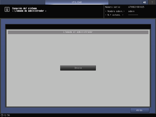 Pulse Conexión sistema en la pantalla Menú Configuración administrador máquina y, a continuación, pulse Llam. centro remoto.