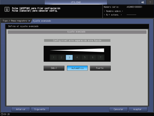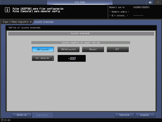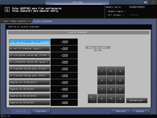 Ajuste avanzado | Define los procesos de transferencia, separación o fusión y otros ajustes avanzados. Ajuste avanzado no se visualiza de forma predeterminada. Póngase en contacto con el servicio de asistencia técnica. | Aj.sal.2ª transfer.(front.): -50 a +50 Aj.sal.2ª transfer.(post.): -50 a +50 2ª u/transfer.borde del.(front.): -50 a +50 2ª u/transfer.borde del.(post.): -50 a +50 2ª transfer-Borde post.(Front): -50 a +50 2ª transfer-Borde post.(Post): -50 a +50 Separación AC (Frontal): ‑50 a +50 Separación AC (Posterior): ‑50 a +50 Separación DC (Frontal): ‑30 a +30 Separación DC (Posterior): ‑30 a +30 Tª centr.corr.fus.sup. (rep.): -20 a +20 Tª centr.corr.fus.sup. (impr.): -20 a +20 Tª borde corr.fus.sup. (rep.): -20 a +20 Tª borde corr.fus.sup. (impr.): -20 a +20 Tª centr.rod.fus.inf.(rep.): de -20 a +20 Tª centr.rod.fus.inf.(impr.): de -20 a +20 Borrar cantidad de Cabecera: 0 a +200 Borr.cant.borde post.: 0 a +200 Bucle de registro(frontal): de -99 a +99 Bucle de registro(posterior): de -99 a +99 Aj.veloc.rodillo transp.IQ: de 0 a +20 Vel.fusión(parte frontal): -200 a +200 Vel.fusión(offset parte post.): -200 a +200 Velocidad de rodillo de registro: de -10 a +10 Ajus. prerregis. bucle (frontal): de -99 a +99 Ahorro cantidad tóner: Act., Desact. Aj. dens. por band.(YMC): 0(Normal), +1, +2, +3(Máx.) Aj. dens. por band.(K): 0(Normal), +1, +2, +3(Máx.) Detec.doble aliment.: Detectar, No detectar Det.atas.papel por desc.: Detectar, No detectar Sep.transf.interm.:Auto, Act., Desact. Modo negro papel grueso:Act., Desact. Corr. alimentación: Act., Desact. Temp. flot. papel PFU: Normal, Demora Rod.fusión inf. Niv.air.vent.refr.: Estándar, Débil, Desact. Config.nivel aire separación aire fusión: de Débil (1) a Fuerte (7), Auto Config. nivel aire succión PFU: de Débil (1) a Fuerte (9), Auto (9) Ajuste separación papel salida: ON(Couché), ON(No couché), Manual, OFF, Val.desplaz. (-50 a +100) |