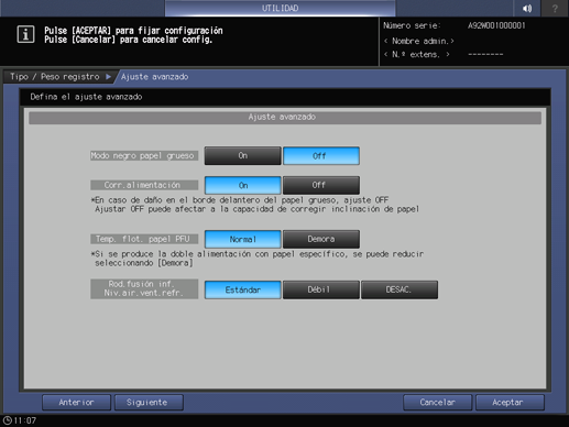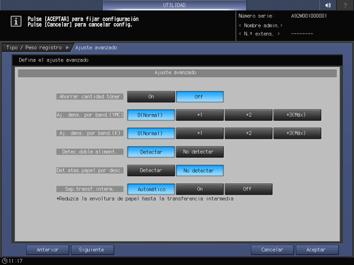 Ahorrar cantidad tóner, Aj. dens. por band.(YMC), Aj. dens. por band.(K), Detec.doble aliment., Det.atas.papel por desc., Sep.transf.interm., Modo negro papel grueso, Corr.alimentación, Temp. flot. papel PFU, Rod.fusión inf. Niv.air.vent.refr., Config.nivel aire separación aire fusión, Config. nivel aire succión PFU, Ajuste separación papel salida