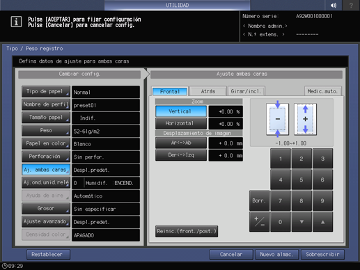 explicación adicionalSi la unidad integrada Color Care IQ-501 está instalada en la máquina, se muestra Medic.auto. Si Ajuste periódico está Activ. en Medic.auto., el ajuste de ambas caras se realiza automáticamente en los intervalos especificados.