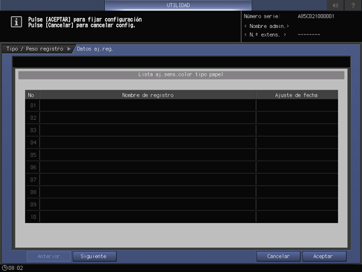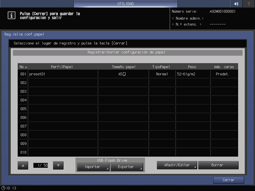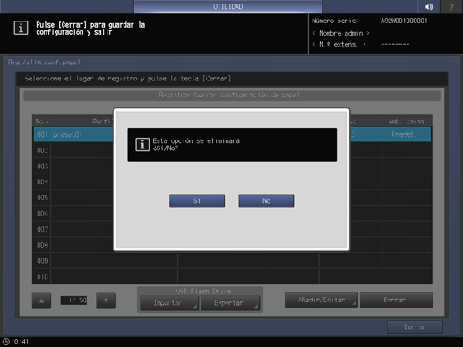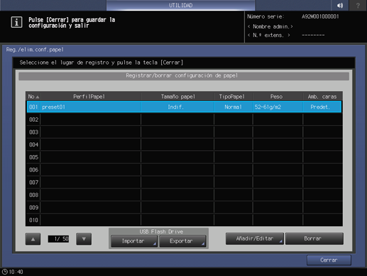 En cualquiera de los dos casos, vuelve a aparecer la pantalla Registrar/borrar configuración de papel.