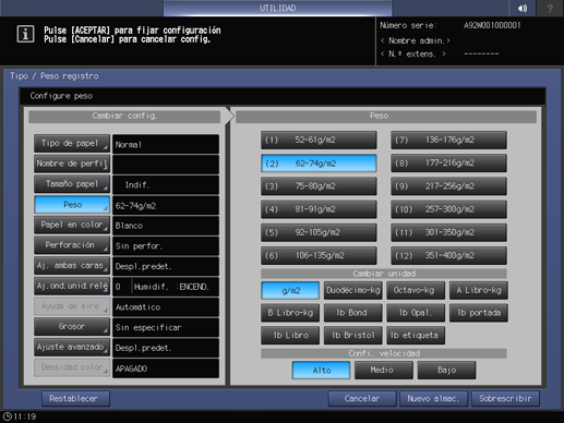 Peso | Seleccione el peso del papel. Recuerde que puede cambiar la unidad de medida del peso. La unidad que se utilizó para registrar este parámetro también se usa para mostrarlo en la pantalla UN.PRINC. y en la pantalla COPIAR cuando se recuperen las especificaciones registradas. | Peso: 52-61 g/m2 62-74 g/m2 75-80 g/m2 81-91 g/m2 92-105 g/m2 106-135 g/m2 136-176 g/m2 177-216 g/m2 217-256 g/m2 257-300 g/m2 301-350 g/m2 351-400 g/m2 Cambio de unidad: g/m2, Duodécimo-Kg, Octavo-Kg, A libro-kg, B libro-kg, lb Bond, lb Index, lb Cover, lb Libro, lb Bristol, lb etiqueta Confi. velocidad: Alta, Media, Baja |
