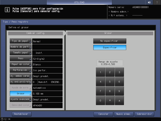 Grosor | En la pantalla se muestra Grosor si la máquina está equipada con el controlador de imagen IC-604. Al seleccionar Especificar, la máquina puede calcular con mayor exactitud la cantidad de papel restante en la bandeja. | Sin especificar, Especificar Rango de ajuste: de 0,050 mm a 0,500 mm |