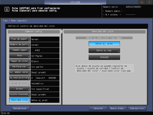 Dens.color | Esta opción se activa cuando se selecciona Activado en Usar contr. man. dens. color, donde se accede desde la pantalla del menú Ajuste, seleccionando Control de densidad de color - Configuración básica. | Datos aj.sens.color tipo papel: Datos aj. pred., Datos aj.reg. , OFF |