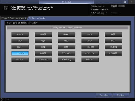 Si elige Estándar, se visualiza la pantalla Configuración tamaño estándar.