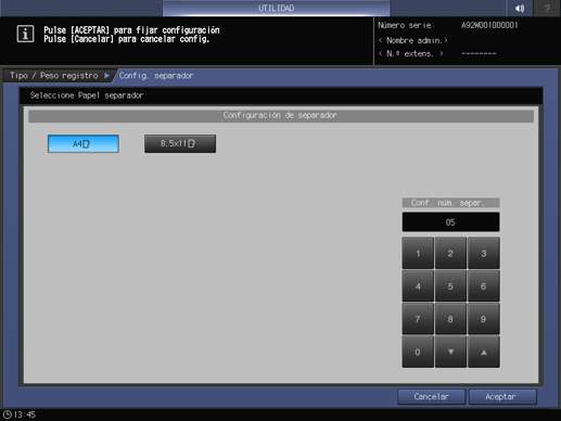Utilice el teclado del panel táctil, downup para introducir el número de separadores. El número de fichas permitidas es de 1 a 15.