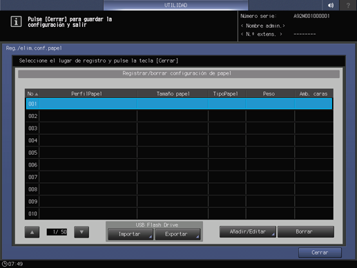 La función de exportación permite guardar todos los datos de configuración de papel de la máquina en una unidad USB flash.