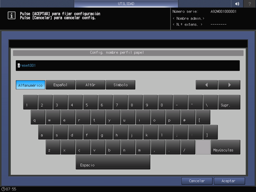 explicación adicionalIntroduzca un nombre para la configuración de papel registrada. Puede introducir hasta 50 caracteres de un byte (25 caracteres de dos bytes).