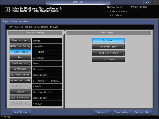 También puede registrar perfiles de papel mediante Reg./elim.conf.papel en la pantalla UN.PRINC. Para obtener más información, consulte Ajuste y registro de papel en la pantalla Registrar/borrar configuración de papel.