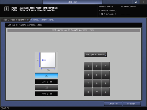 Si elige Personalizado, se visualiza la pantalla Configuración de tamaño personalizado.