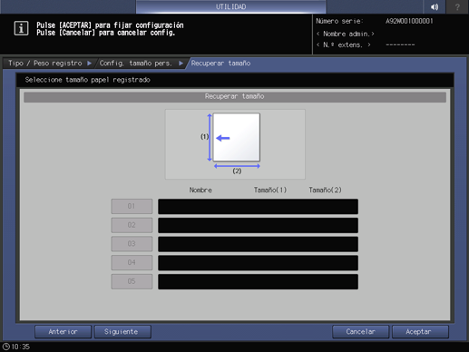 explicación adicionalUtilice las teclas Anterior y Siguiente para desplazarse hasta el tamaño personalizado correspondiente. En la pantalla se muestran las entradas del 01 al 20.