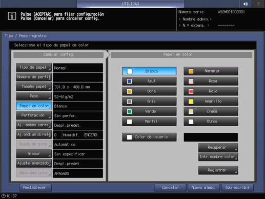 Papel de color | Especifique el color del papel. Ello evita impresiones en papel con colores mixtos. | Blanco, Azul, Ocre, Gris, Verde, Marfil, Naranja, Rosa, Rojo, Amarillo, Crema, Otros, Color de usuario |