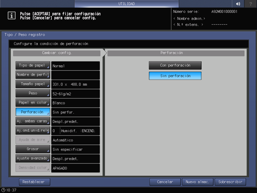 Perforación | Especifique si el papel presenta agujeros. Si se indica que el papel tiene orificios, no se puede perforar aunque se seleccione Perforación en Configuración salida. | Con perforación, Sin perforación |