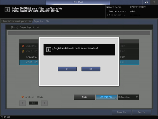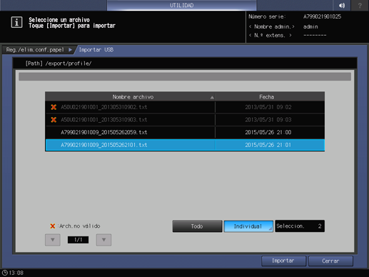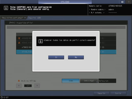 Si utiliza la opción de importación [Todo], se importarán todos los datos de tamaño de papel y configuración papel guardados en la unidad USB flash y los datos registrados en la máquina se sobrescribirán.