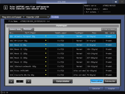 explicación adicionalCon la opción Sobrescribir, los datos se importan sobre el mismo número de la configuración de papel de la máquina.