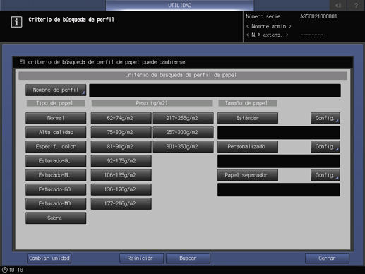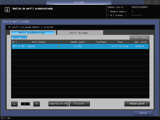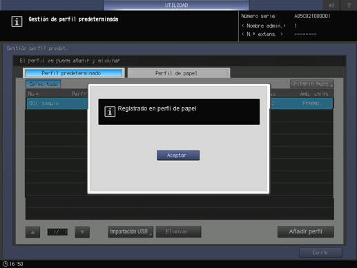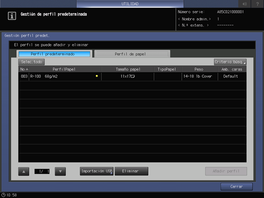 El perfil predeterminado es un perfil de papel previamente registrado en la máquina. Si añade un perfil predeterminado a un perfil de papel, puede utilizarlo como perfil de papel. Es posible buscar o eliminar un perfil predeterminado.