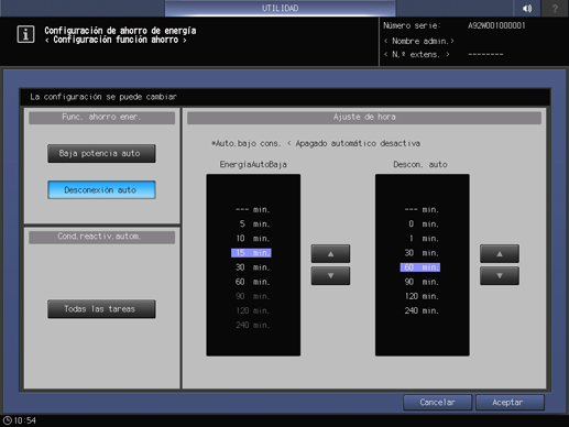 Desconexión auto: --- min., 0 min., 1 min., 30 min., 60 min., 90 min., 120 min., 240 min.
