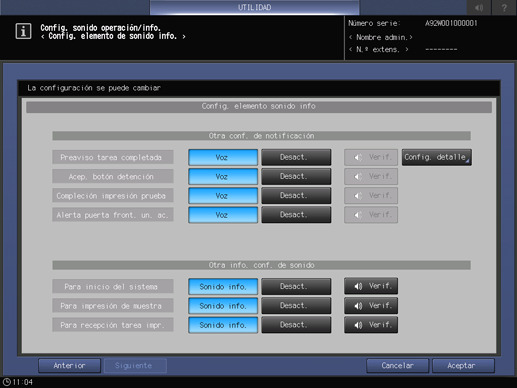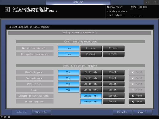 Especifique el número de repeticiones del sonido o voz de información que se reproduce cuando una tarea se detiene por atasco o falta de papel, y especifique también si se debe activar el sonido individual para algunos elementos.