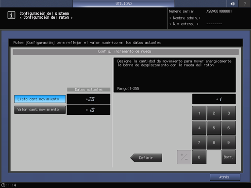 Valor cant.movimiento | Especifique el rango de entrada para la introducción de valores usando la rueda de desplazamiento. | +10 |