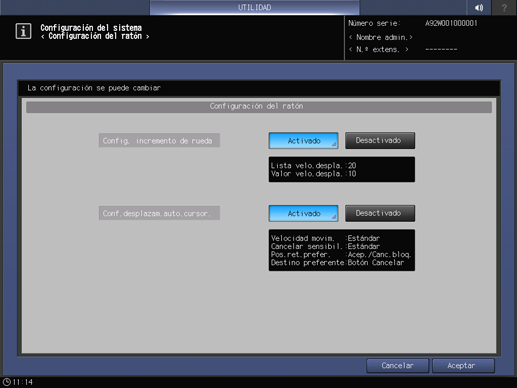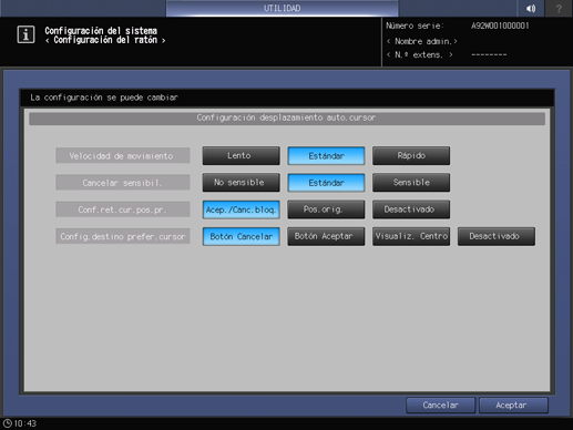 Config.destino prefer.cursor | Seleccione la posición preferente para colocar el cursor del ratón cuando se visualiza una pantalla. | Botón Cancelar, Botón Aceptar, Visualiz. Centro, Desactivado |