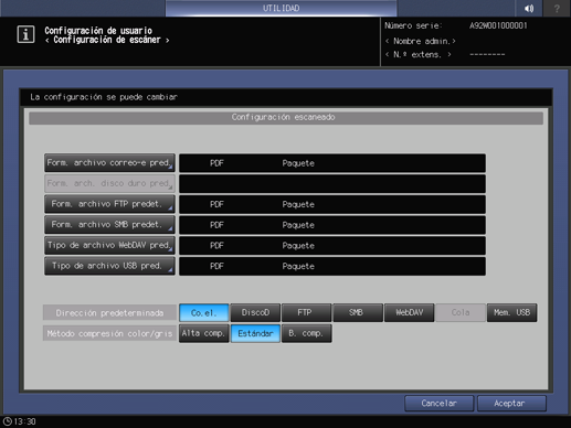 Form arch. disco duro pred. | Seleccione el valor predeterminado de Tipo de archivo para Escanear a HDD. Esta opción no está disponible para esta máquina. | - | |