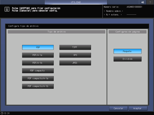 En el elemento Tipo de archivo, seleccione el tipo de archivo deseado y, a continuación, pulse Paquete o Dividido en Configuración página.