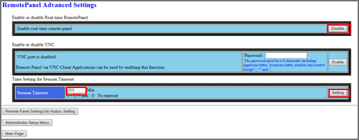 • Una vez activada o desactivada la función de panel remoto en tiempo real o VNC, el cambio de configuración no se acepta hasta que transcurren 10 minutos. Para restablecer la configuración, espere 10 minutos o vuelva a abrir la pantalla Remote Panel Advanced Settings después de 10 minutos.