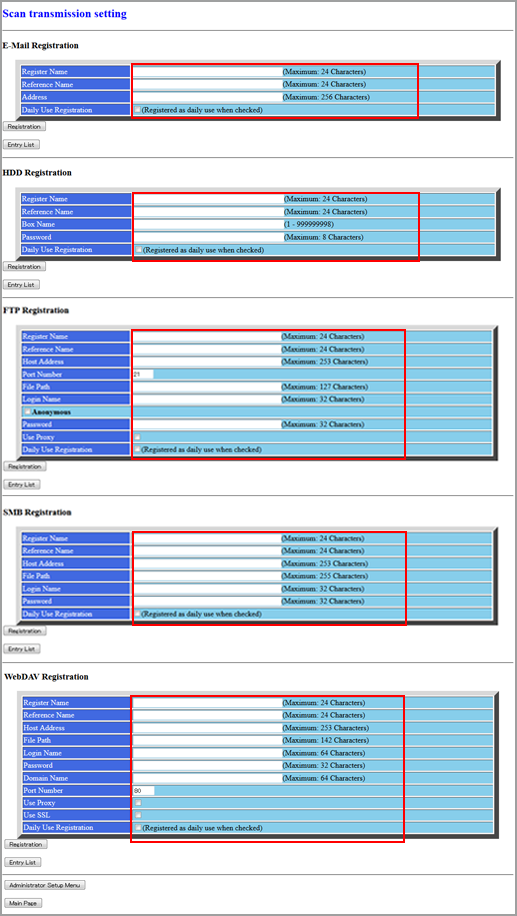 Registre el correo electrónico, HDD, FTP, SMB y WebDAV, según sea necesario.