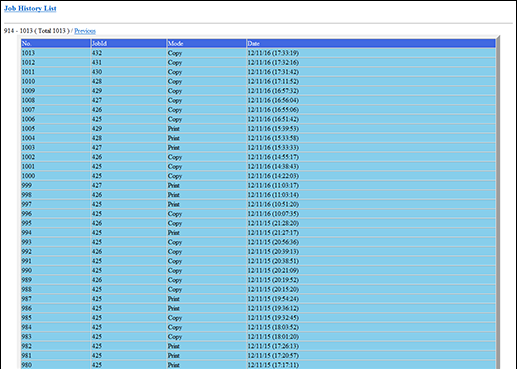 explicación adicionalLa lista incluye el número en el historial (N.º), el número de tarea (JobId), el modo (Modo) y la fecha en la que se realizó la tarea (Fecha).
