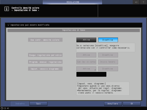 spiegazione aggiuntivaPer eseguire periodicamente il Controllo densità colore, selezionare Attiva. Se non (ma per regolarlo manualmente), selezionare Disattiva. Se si seleziona Attiva, la macchina stabilisce automaticamente quando eseguire la regolazione periodica (regolazione automatica).