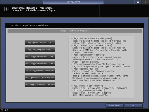 Eseguire le operazioni di regolazione per Reg gamma automatica, Reg registraz colore, Modo aggiornamento toner1, Modo aggiornamento toner2, Modo aggiornam. fusione, Mod. pulizia caricamento, Mod.aggiornamento tamburo.